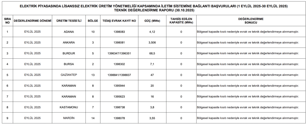 - Ekim 2025 sonu itibarıyla kapasite yok: 81 ilde lisanssız projelere yeni kapasite sağlanamıyor.
